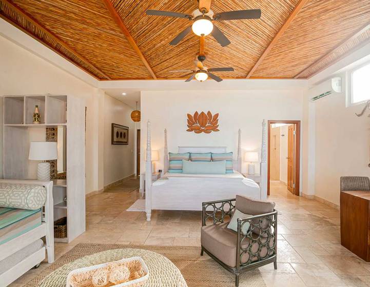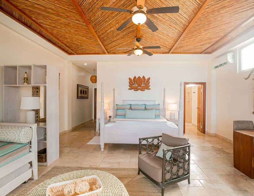 Price includes taxes and resort fees. These rooms are located about 60 feet from the beach and offer spectacular views of the Caribbean Sea. The rooms feature a king size bed with and a twin trundle daybed. They are between 650 – 800 square feet interior with 250-300 square feet veranda with three-piece bath, tumbled marble tile, hand- painted sink, private bathroom and spacious shower.