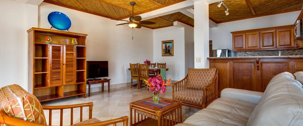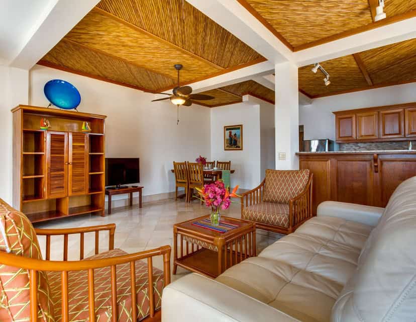 Prices include taxes and resort fees. Deluxe rooms are on second floor featuring a 656 square feet interior, 144 square feet in covered veranda. These rooms also offer a four piece bath with granite counters, marble sink and tile. Spacious marble tile shower. There are two room options, One room that has a king and a queen wall bed in the living room and the other option is a honeymoon room with king bed with bath tub in bedroom/living area.